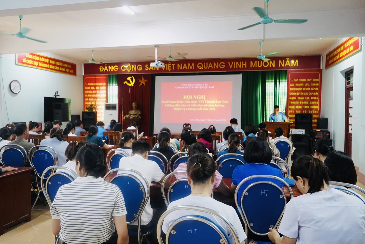 Chiều ngày 7/8, Trung tâm Y tế huyện Lục Nam tổ chức Hội nghị sơ kết Công đoàn 6 tháng đầu năm, phương hướng nhiệm vụ 6 tháng cuối năm 2024. Dự và chủ trì hội nghị có đồng chí Phạm Thị Thu Hà- Chủ tịch Công đoàn, Phó giám đóc trung tâm Y tế huyện Lục Nam, về tham dự Hội nghị còn có các đồng chí trong Ban chấp hành công đoàn cơ sở và toàn thể các đồng chí tổ trưởng công đoàn của 20 khoa phòng và 25 xã, thị trấn.